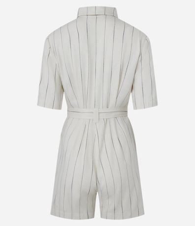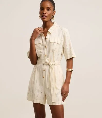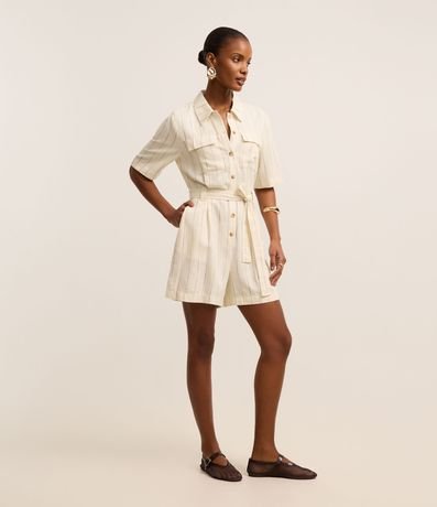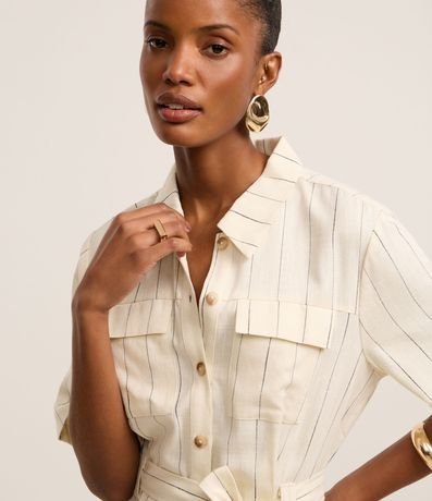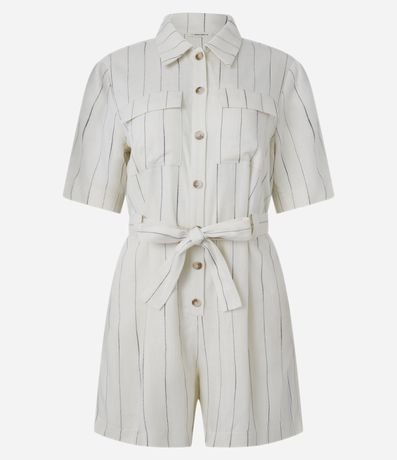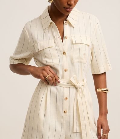 Ref: Macaquinho feminino confeccionado em viscolinho, com gola colarinho, manga curta, bolsos com lapela, fechamento por botões e amarração na cintura.