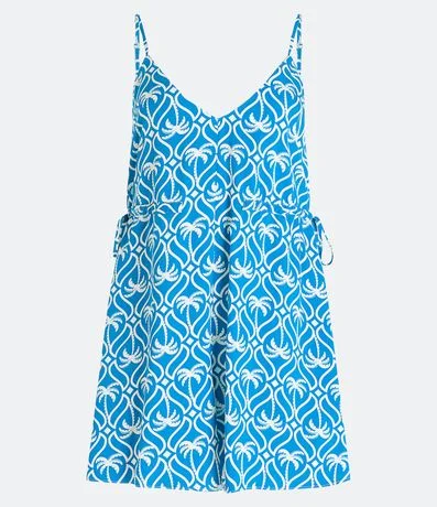 Ref: Macaquinho fresquinho e curto, em viscose, alcinhas finas, ajuste com amarração nas laterais da cintura e estampa em repetição de coqueirinhos.