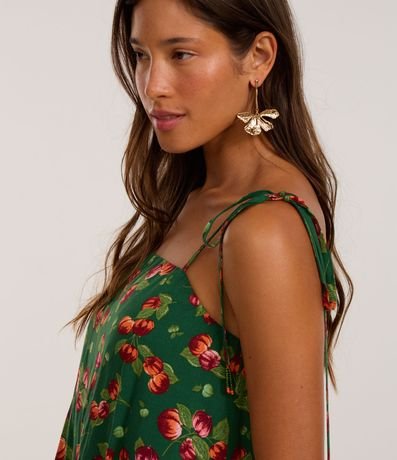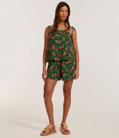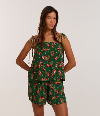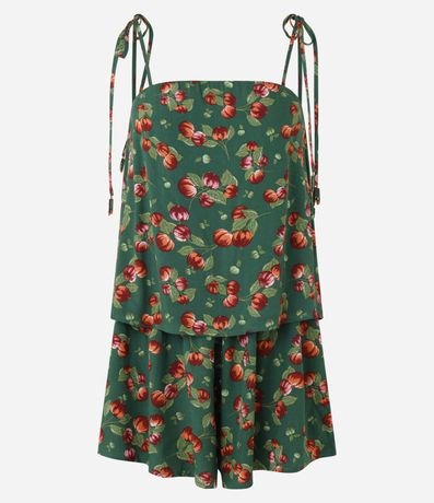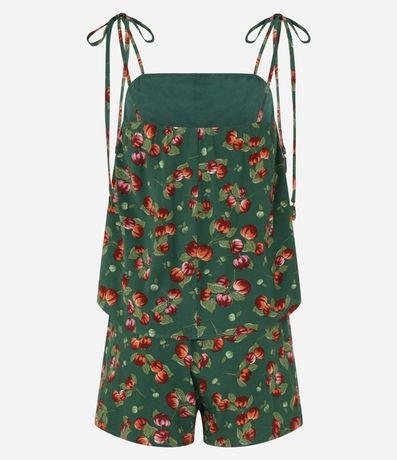 Ref: Macaquinho curto confeccionado em viscose certificada mais sustentável, amarração nas alcinhas e estampa tropical com pitangueira.
