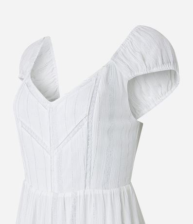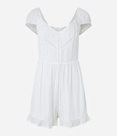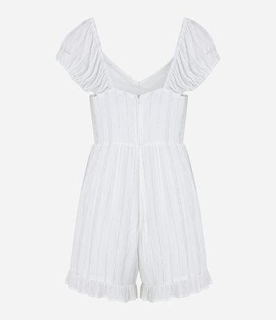 Ref: Macaquinho soltinho com mangas curtas, copinho, fechamento por zíper nas costas, detalhes em entremeios e babado na barra.