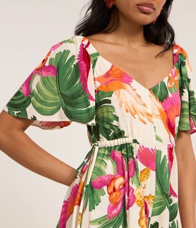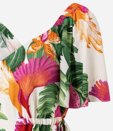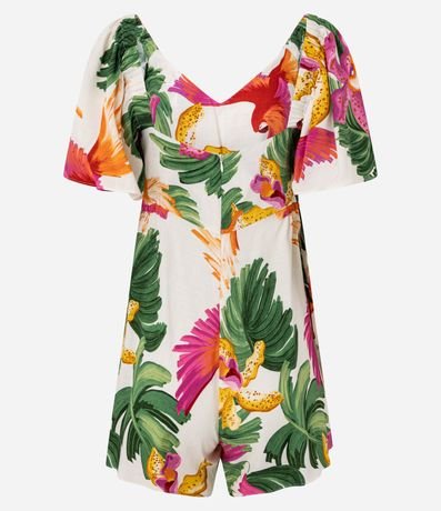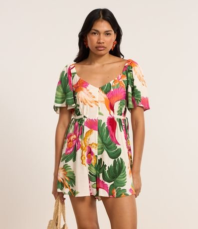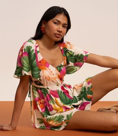Macaquinho feminino em viscose certificada com decote em v, manga curta, estampa de arara com flores e detalhe de amarração na lateral com túnel franzido.