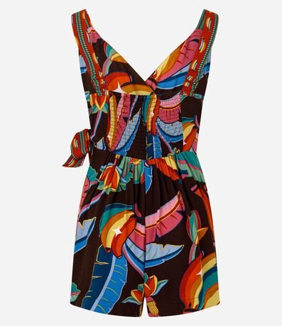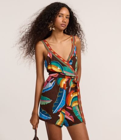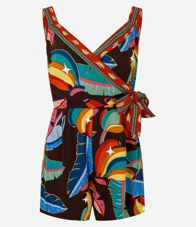 Ref: Macaquinho de alças largas, confeccionada em viscose, com transpasse com amarração, lastex nas cosyas e estampa tropical. Este produto possui material mais sustentável em sua composição, sendo ambientalmente mais responsável.