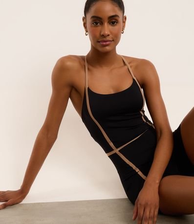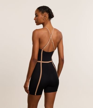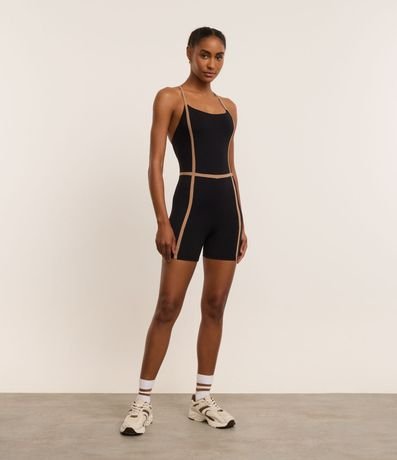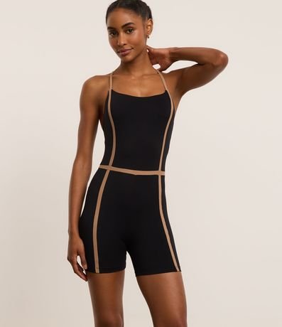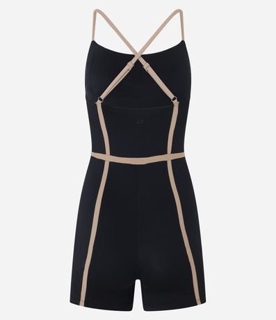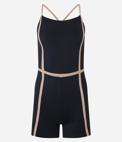 Ref: Macaquinho de microfibra ideal para práticas esportivas e treino na academia. A peça tem alças finas reguláveis cruzadas nas costas e linhas contrastantes no corpo.