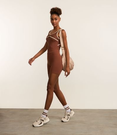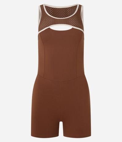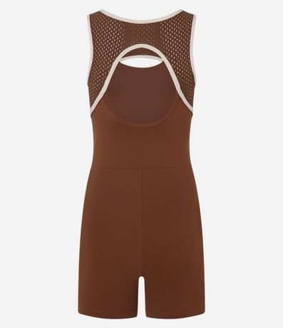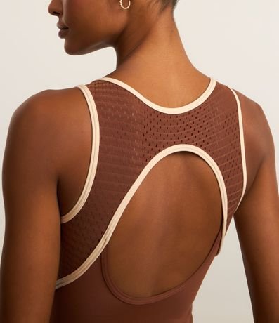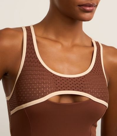 Ref: Macaquinho de microfibra confeccionado seguindo boas práticas ambientais. A peça tem alças largas, pala texturizada de furinhos, recorte vazado na frente e nas costas e acabamento com vieses contrastantes.