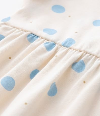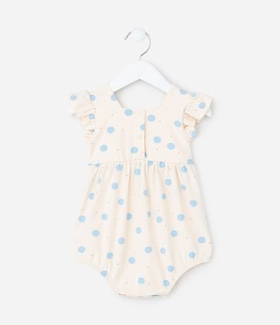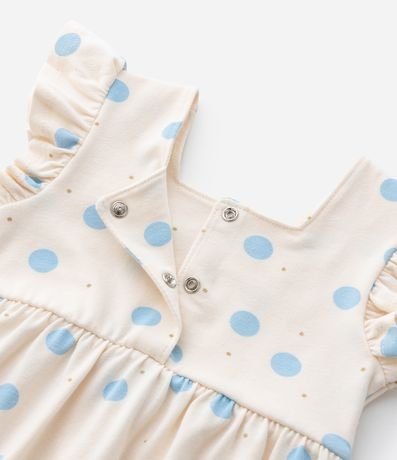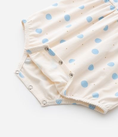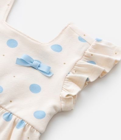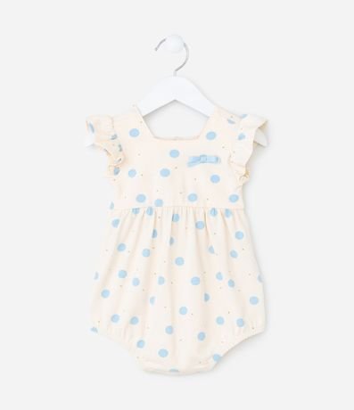 Ref: Macaquinho infantil de modelo banho de sol, confeccioando com com boas práticas ambientais e algodão certificado bci. Possui decote quadrado, mangas com babadinhos, lacinho no peito e estampa em poá delicado. A peça contém ainda fechamento no entrepernas.