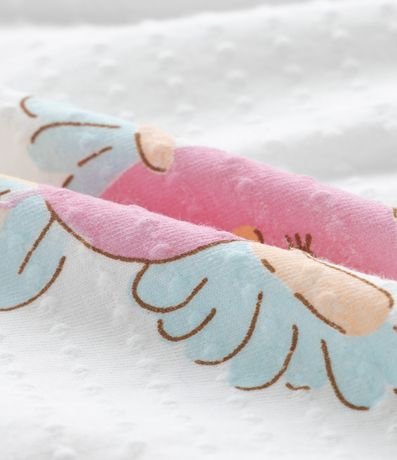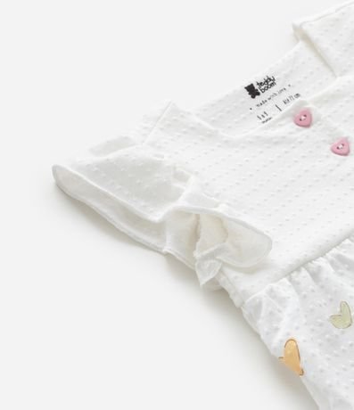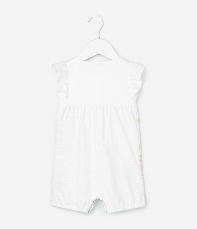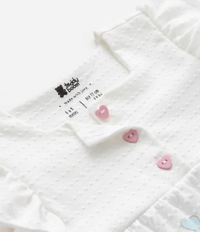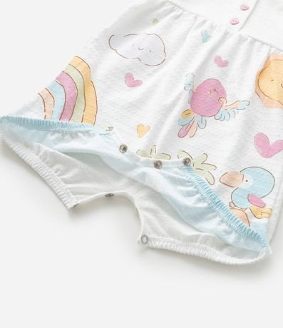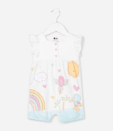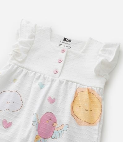 Macaquinho de algodão para bebês. A peça tem manga de babadinho, adorno de bolinhas, estampa de elementos fofos de paisagem e texturizado.