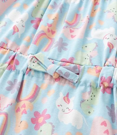 Macaquinho infantil confeccionado em algodão certificado bci. Possui alças finas, elástico no decote, lacinho na cintura, fechamento no entrepernas e estampa de dinos, unicórnios e arco-íris.