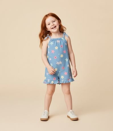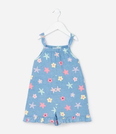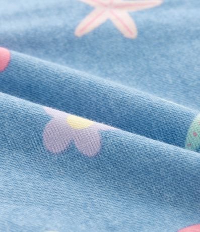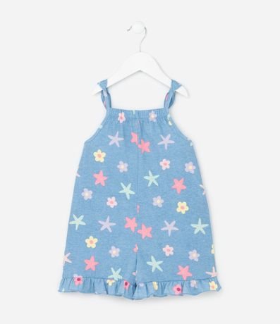 Macaquinho infantil confeccionado em algodão mais sustentável, com alcinhas finas, elástico no busto e estampa de fundo do mar.