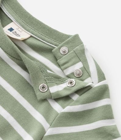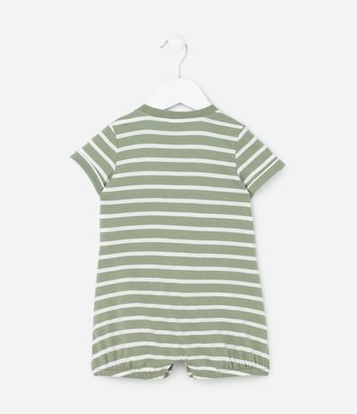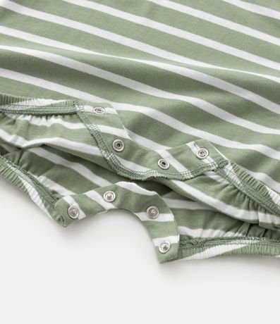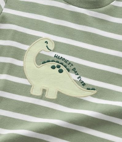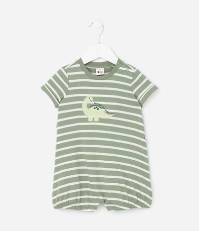 Ref: Macaquinho infantil confeccionado em algodão, com gola redonda, manga curta e estampa de listras e dinossauro.