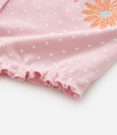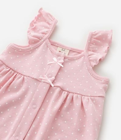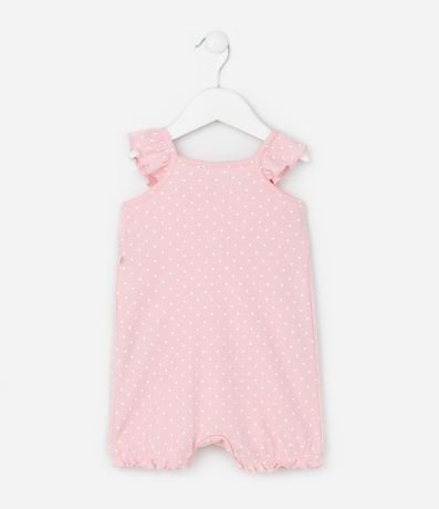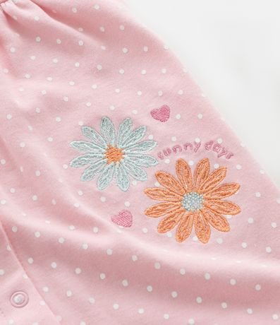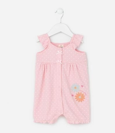Ref: Macaquinho confeccionado em suedine mais sustentável, no modelo curto. Possui gola redonda, com lacinhos, manga de babadinho, fechamento no entrepernas, estampa poá e bordado de flores.