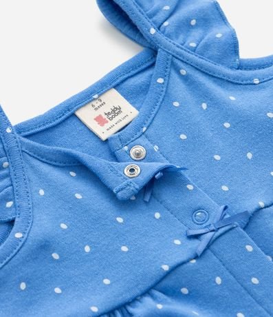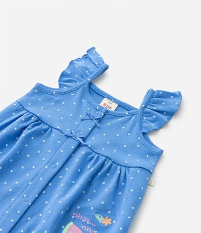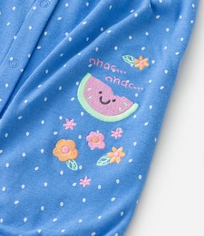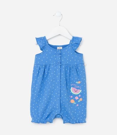 Ref: Macaquinho infantil com babadinho nas alças, estampa em poá e com melancias. Possui fechamento no entrepernas.