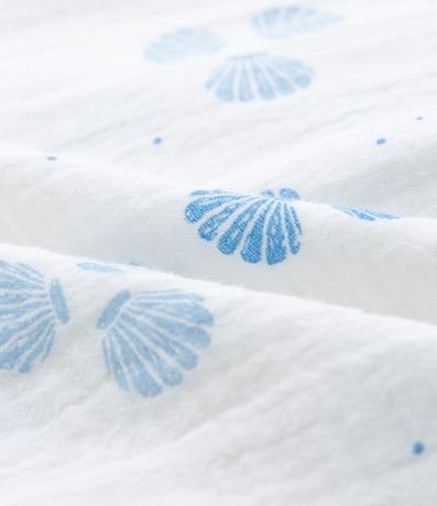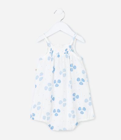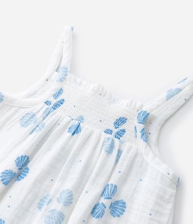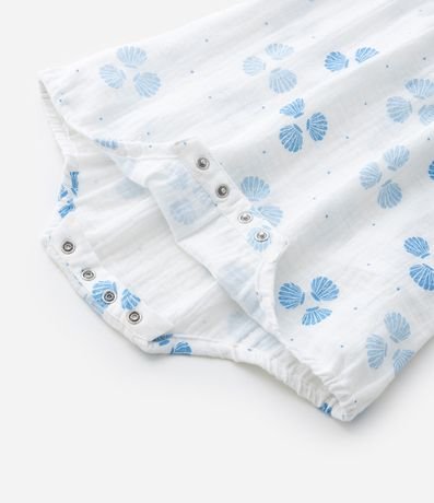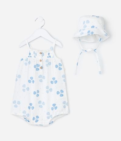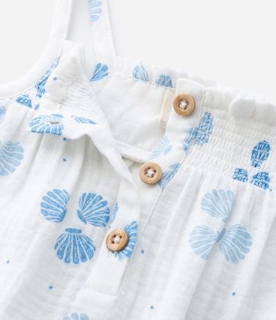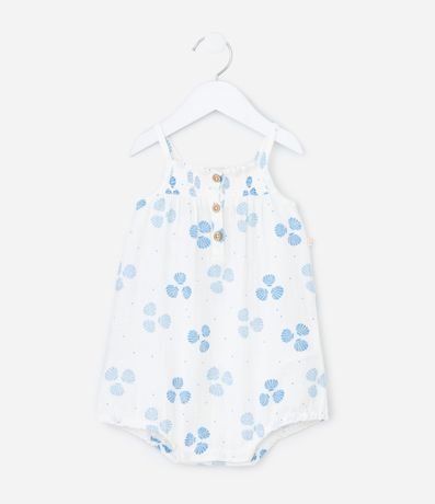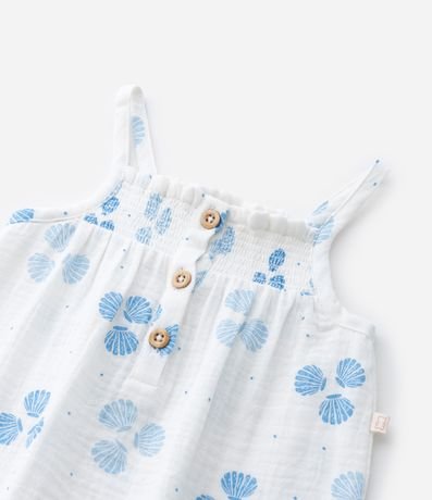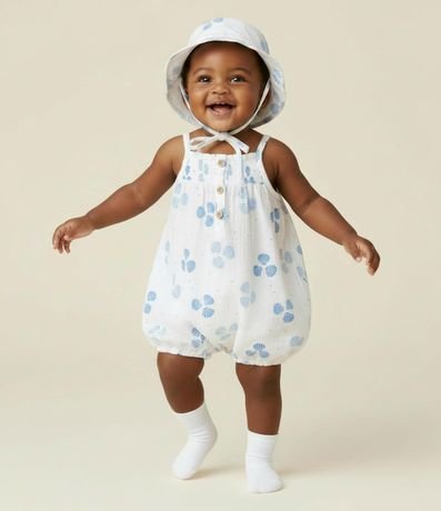 Ref: Macaquinho infantil confeccionado em tricoline mais sustentável, no modelo curto. Possui decote quadrado, alcinhas finas, elástico no busto, abotoamento e fechamento no entrepernas, acompanha chapéu, com cordinha para amarração. Ambos com estampa de conchas.