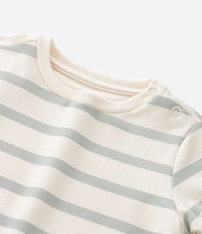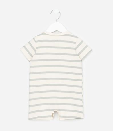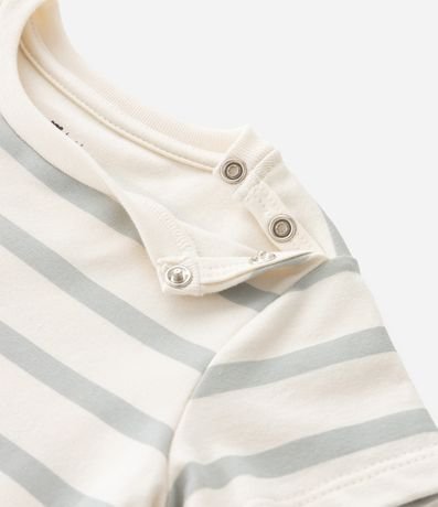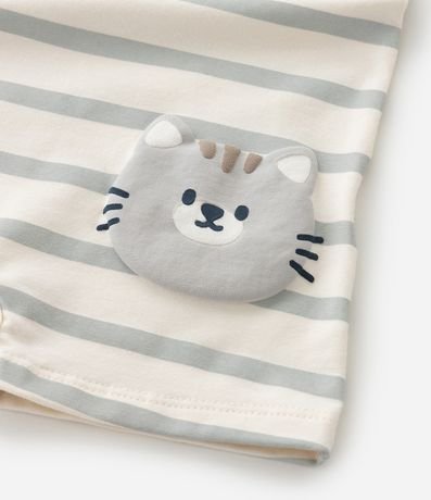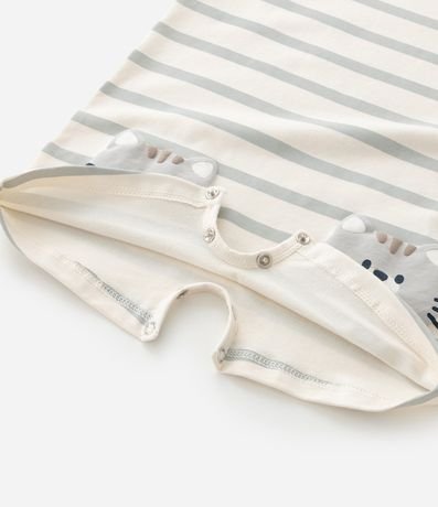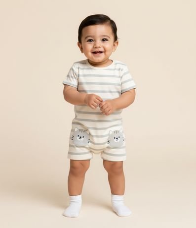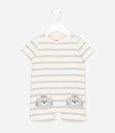 Ref: Macaquinho infantil para bebês, confeccionado em malha de algodão, com gola redonda e mangas curtas. Possui padronagem de listras e estampa de gatinhos.