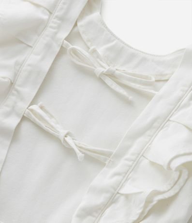 Macaquinho infantil com gola redonda, sem mangas, com lacinhos para amarração nas costas e babados nas cavas.