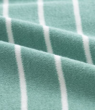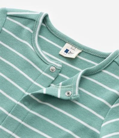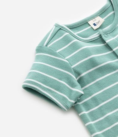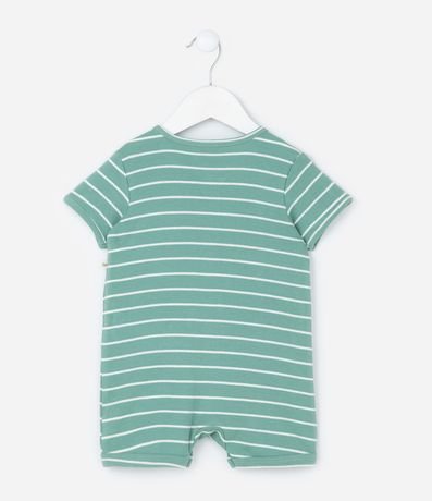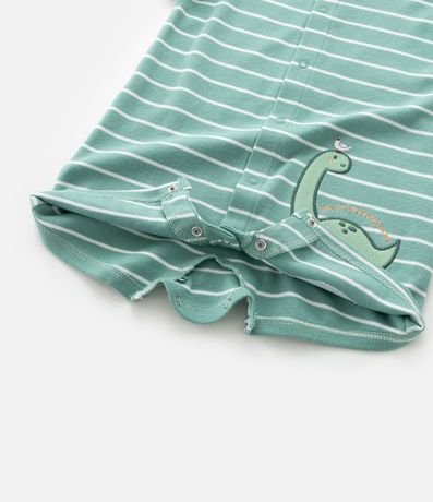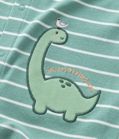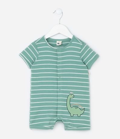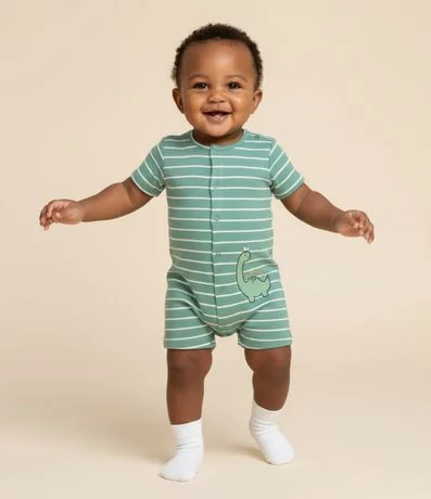 Ref: Macacão infantil confeccionado em suedine mais sustentável, no modelo curto. Possui gola redonda, manga curta, abotoamento, fechamento no entrepernas, listrado e com bordado de dinossauro.