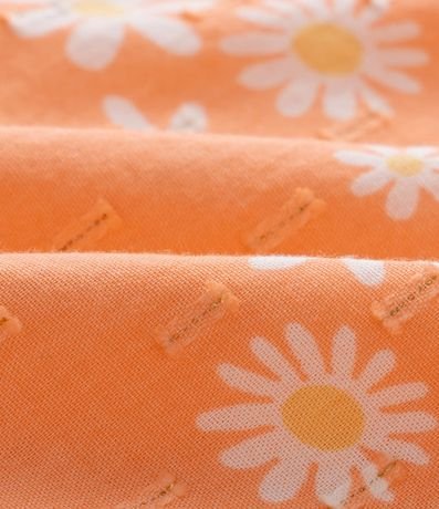 Macaquinho para bebês confeccionado em tricoline de algodão BCI. A peça é cheia de detalhes fofos: botões em forma de florzinha, babado nos ombros, estampa de margaridas e superfície texturizada.