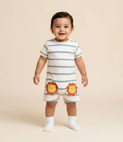 Ref: Macaquinho infantil confeccionado em algodão certificado BCI e boas práticas ambientais. Possui gola redonda, mangas curtas e fechamento entrepernas por botões de pressão. Conta com listras horizontais e estampa localizada de leão nos joelhos.