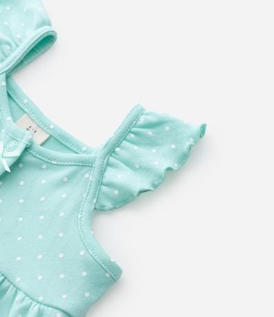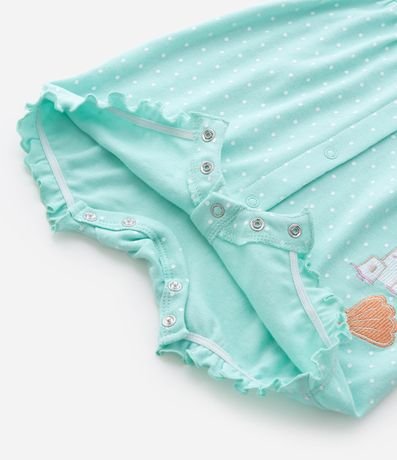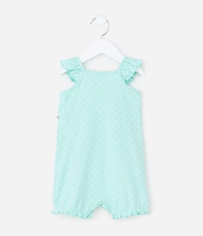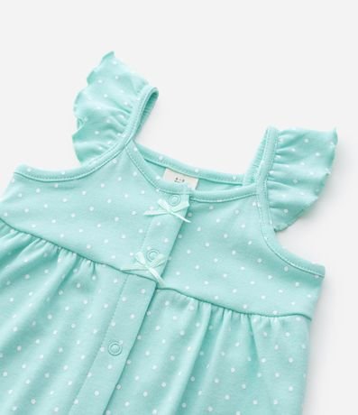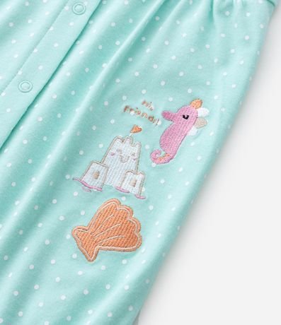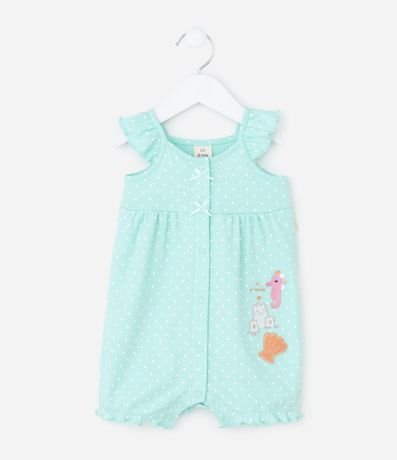 Ref: Macaquinho em suedine com estampa de poá, trazendo babados delicados nas alças e frente com bordados inspirados no fundo do mar. Possui abertura frontal por botões de pressão e estrutura macia confeccionada em algodão certificado BCI e boas práticas ambientais.