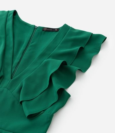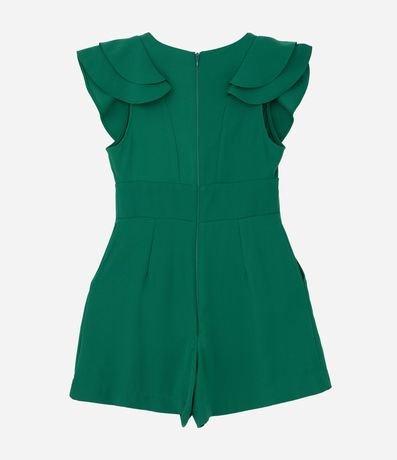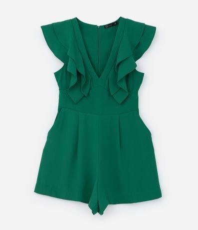 Ref: Macaquinho sem mangas com decote V, babados nos ombros, recorte na cintura e pregas logo abaixo além de fechamento nas costas por zíper.