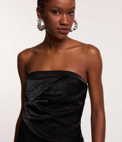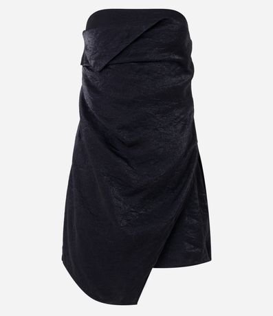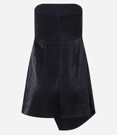 Macaquinho short saia, curto com decote tomara que caia, dobra do busto, fechamento por zíper nas costas e saia transpassada e assimétrica.