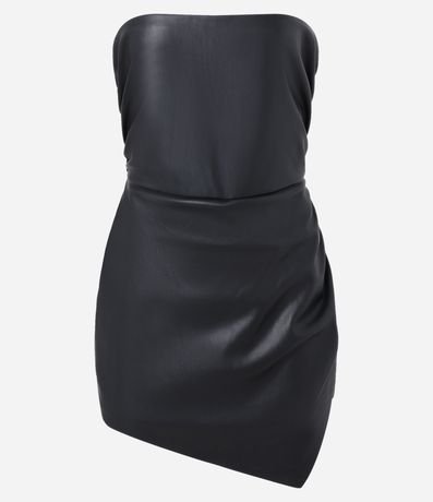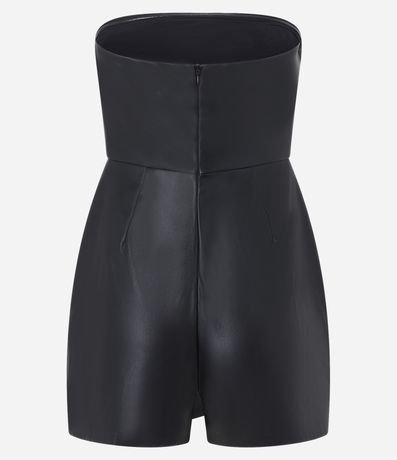 Macaquinho curto, short saia com decote tomara que caia, franzidinhos nas laterais, confeccionado em material sintético, pu e barra assimétrica.