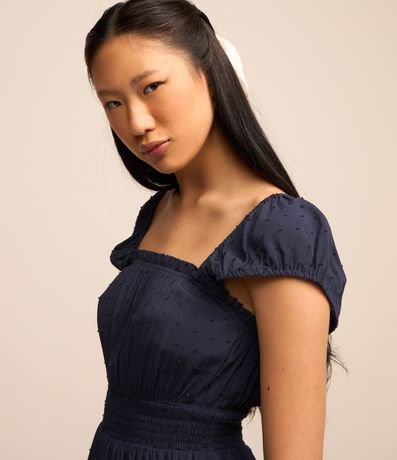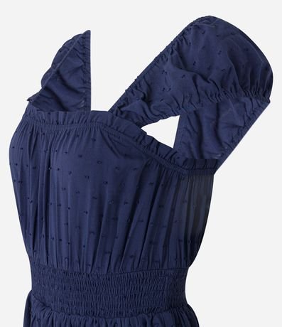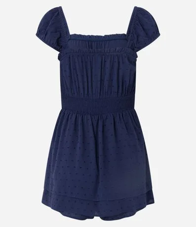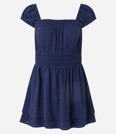 Ref: Macaquinho short saia, curto com decote quadrado, manga curta, elástico na cintura, texturizado e com babados na saia.