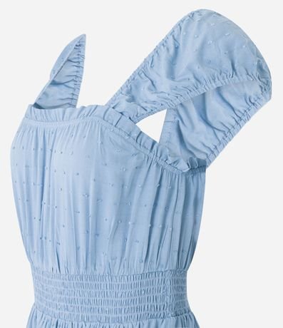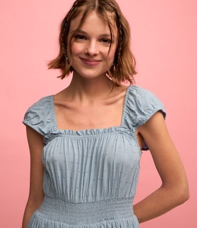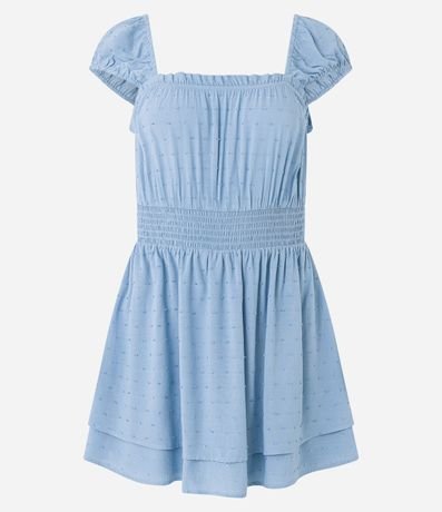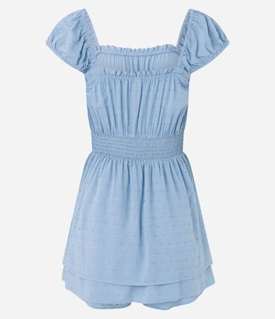 Ref: Macaquinho short saia, curto com decote quadrado, manga curta, elástico na cintura, texturizado e com babados na saia.