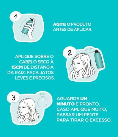 Testar em um papel a força do spray, antes de aplicar. Agitar o produto, aplicar nos cabelos secos a uma distância de 15cm da raiz com a embalagem na vertical. Fazer jatos leves e precisos. Caso aplique muito, passe um pente para tirar o excesso.