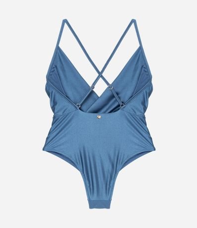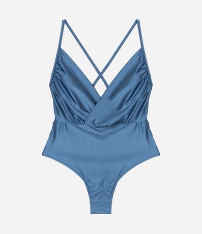 Ref: Maiô feminino confeccionado em microfibra, com decote V transpassado e alças finas reguláveis cruzadas nas costas. Sem estampa, possui acabamento levemente brilhoso, textura franzida no busto e corte cavado.