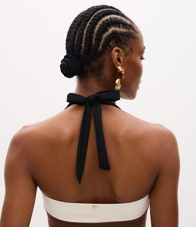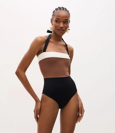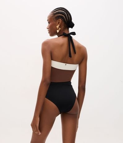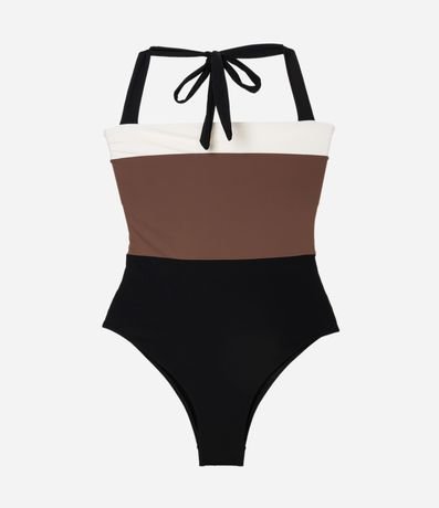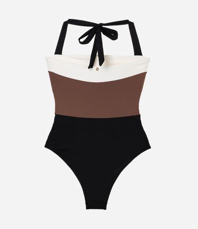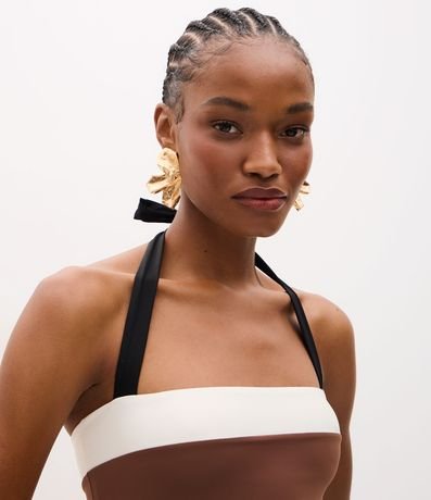Maiô feminino confeccionado em microfibra. O modelo possui decote reto com amarração no pescoço e estampa bloco de cor, garantindo visual moderno, sustentação e conforto para a linha praia.