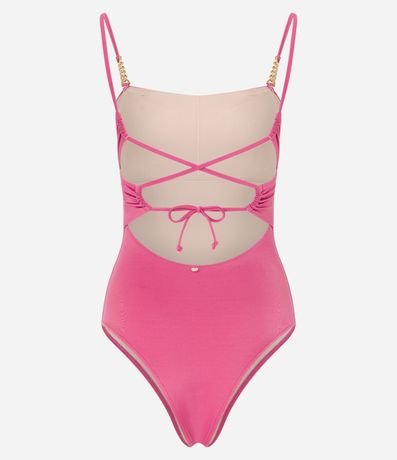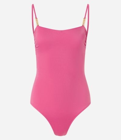 Ref: Maiô de microfibra sem estampa. Peça com decote reto, alças finas, detalhe de correntes metalizadas, bojos removíveis e amarração nas costas.