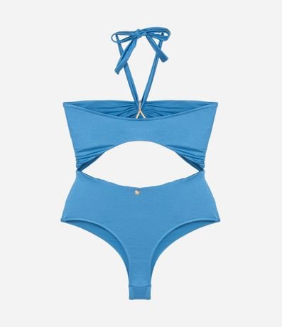Maiô confeccionado em microfibra levemente brilhante e sem estampa. A peça tem amarração no pescoço, nó e aviamento de estrela no busto, bojos removíveis e recortes vazados no abdômen e nas costas.