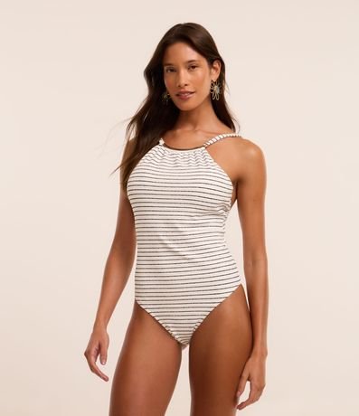 Maiô feminino confeccionado em microfibra canelada. A peça tem decote halter, que valoriza ombros e colo, placa metálica e estampa listrada. As alças são reguláveis e os bojos removíveis. Experimente usar este maiô também como um body!