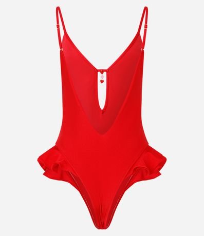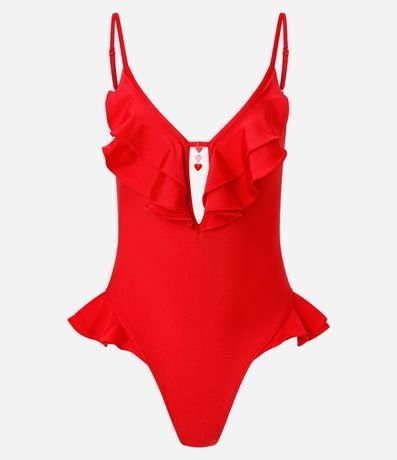 Ref: Maiô confeccionado em microfibra, com decote em v profundo. Possui alças finas estilo espaguete, paralelas, com reguladores metálicos. As costas apresentam decote em u. As cavas das pernas têm corte médio, com modelagem asa delta. Conta com babado duplo no quadril e no decote frontal, além de detalhe no decote frontal composto por três pingentes de coração pendurados, que adicionam um toque delicado à peça.