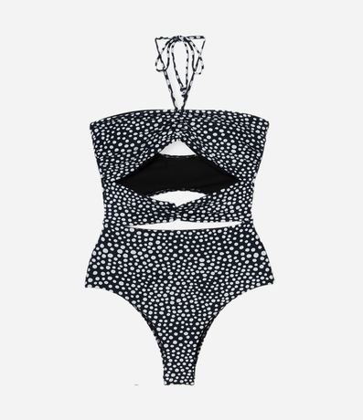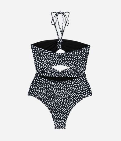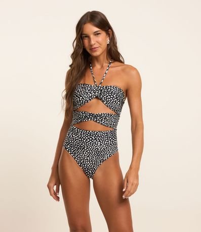 Maio feminino em microfibra com estampa de poá e recorte vazado.