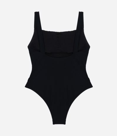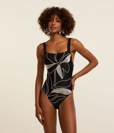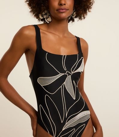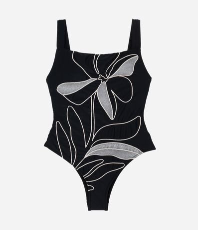 Ref: Maiô feminino confeccionado em microfibra certificada Oeko Tex. A peça tem alças largas, decote quadrado e bordado frontal contrastante de flor. Os bojo são removíveis.