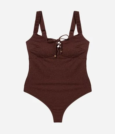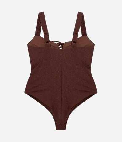 Maiô feminino confeccionado em poliamida, no modelo fio duplo. Possui decote com amarração, alças com frufru, fio metalizado, textura e proteção UVA e UVB.