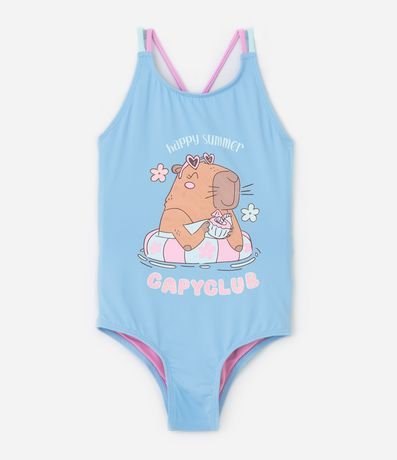 Ref: Maiô infantil em microfibra, com alças tranças nas costas, estilo, com estampa frontal de capivara club.