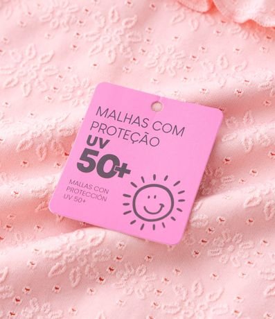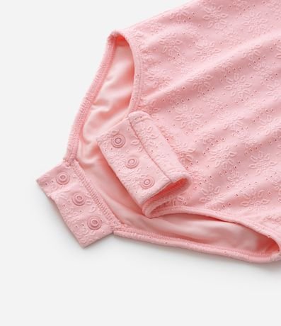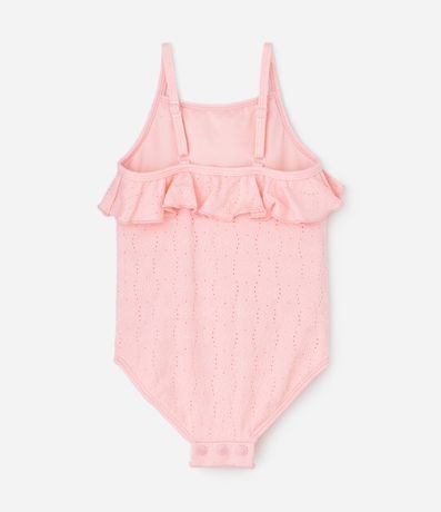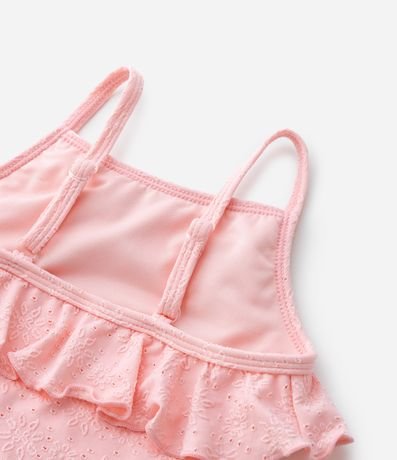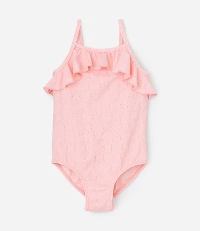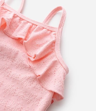 Ref: Maiô infantil confeccionado em microfibra, com alças finas fixas, sem estampa e com babadinho no busto. Sem estampa, possui textura floral com furinhos e proteção UV.