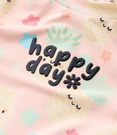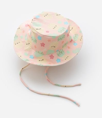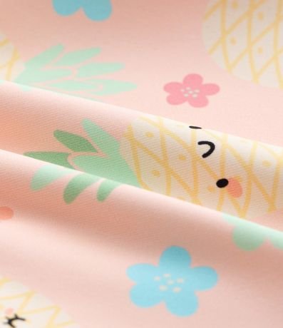 Ref: Maiô infantil com chapéu de praia composto por duas peças estampadas de abacaxis. O maiô tem mangas longas, fechamento por zíper e detalhe de babados. O chapéuzinho tem cordão para amarração.