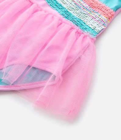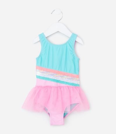 Ref: Maiô infantil confeccionado em microfibra, com gola redonda, alças largas, estampa de arco-íris e saia de tule removível.