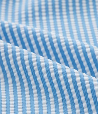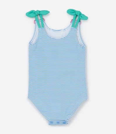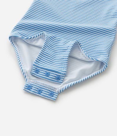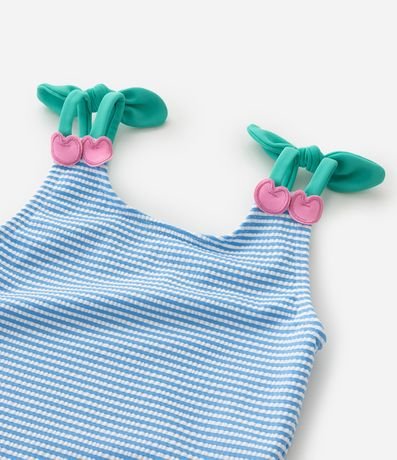 Maiô infantil confeccionado em microfibra com estampa listrada horizontal e texturizado. As alças são de cerejinhas e possui abotoamento no entrepernas.