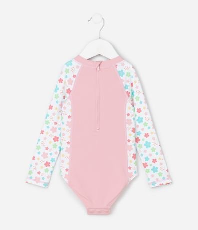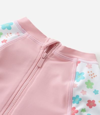 Maiô infantil confeccionado em microfibra leve com toque macio, trazendo mangas longas e recortes laterais estampados com flores. Possui gola redonda, fechamento traseiro por zíper e estampa divertida de gatinho com frutas bordadas. Modelagem confortável ideal para dias de praia ou piscina.