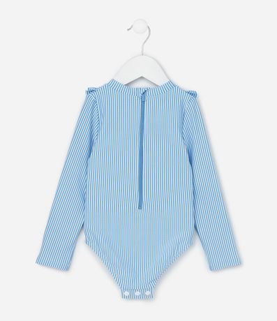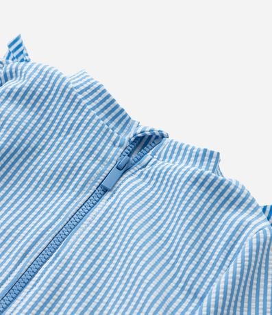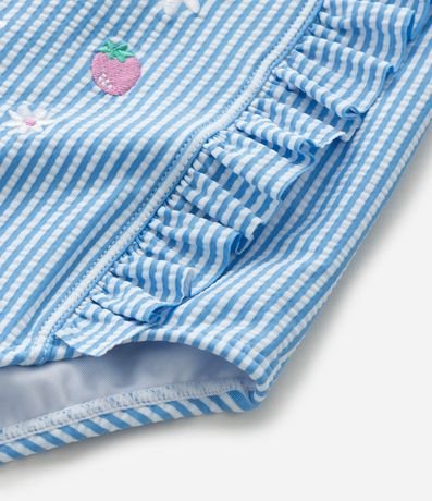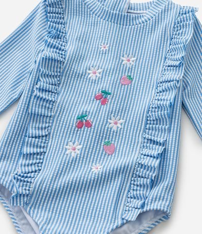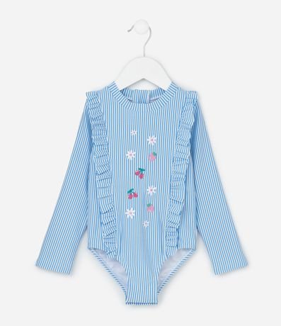 Ref: Maiô infantil com proteção uv, com gola redonda, manga longa, e estampa de listras com bordado de frutinhas e flores. Possui babadinho e fechamento por zíper.