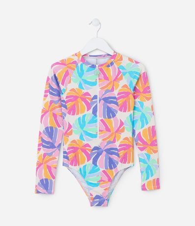 Ref: Maiô infantil com gola redonda, mangas longas, fechamento por zíper frontal e estampa de folhagens. Possui proteção UV.