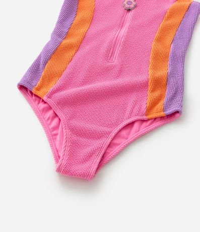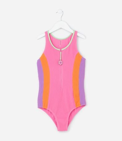 Maiô infantil em microfibra, com proteção UV, decote redondo, tiras largas, textura e listras contrastantes nas laterais.
