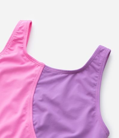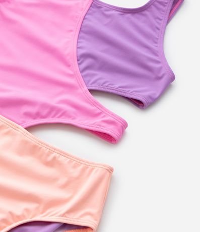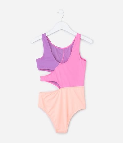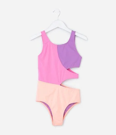 Ref: Maiô infantil confeccionado em microfibra leve, com proteção UV, com alças médias. Possui estampa de blocos de cores e recortes laterais vazados.