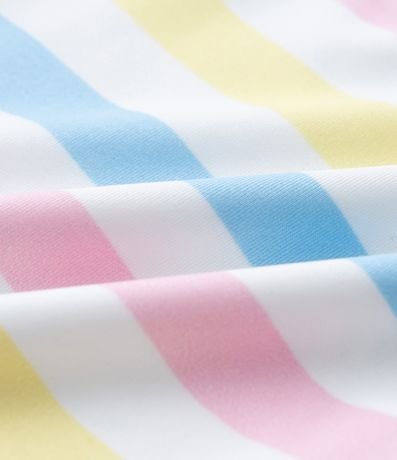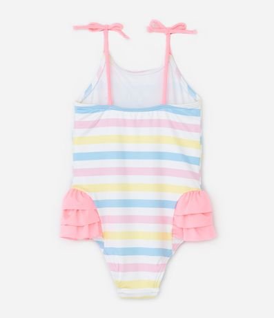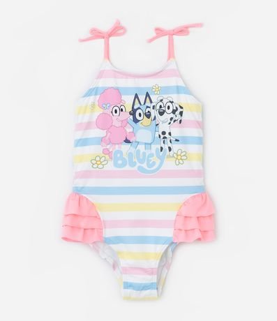 Ref: Maiô infantil confeccionado em microfibra através de boas práticas ambientais. Possui gola redonda, alças finas, com lacinhos, babadinhos, estampa de listras e Bluey.