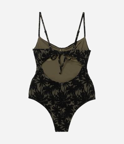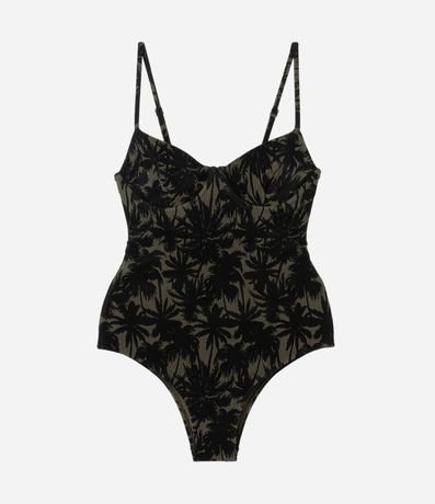 Ref: Maiô confeccionado em microfibra estampada de coqueiros. A peça tem alças paralelas reguláveis, busto meia taça com aro e amarração nas costas.