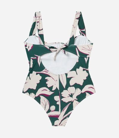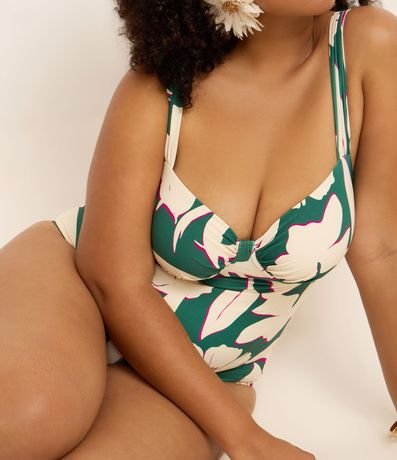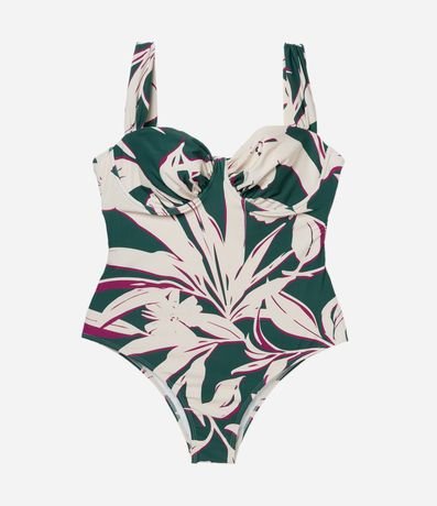 Ref: Maiô de microfibra com estampa de folhagem, busto meia taça e alças largas.